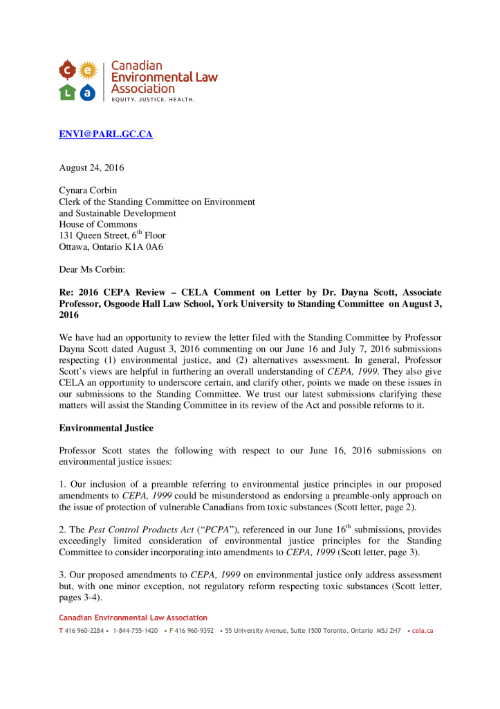 2016 CEPA Review – CELA Comment on Letter from Osgoode Hall Law School, York University to Standing Committee on August 3, 2016