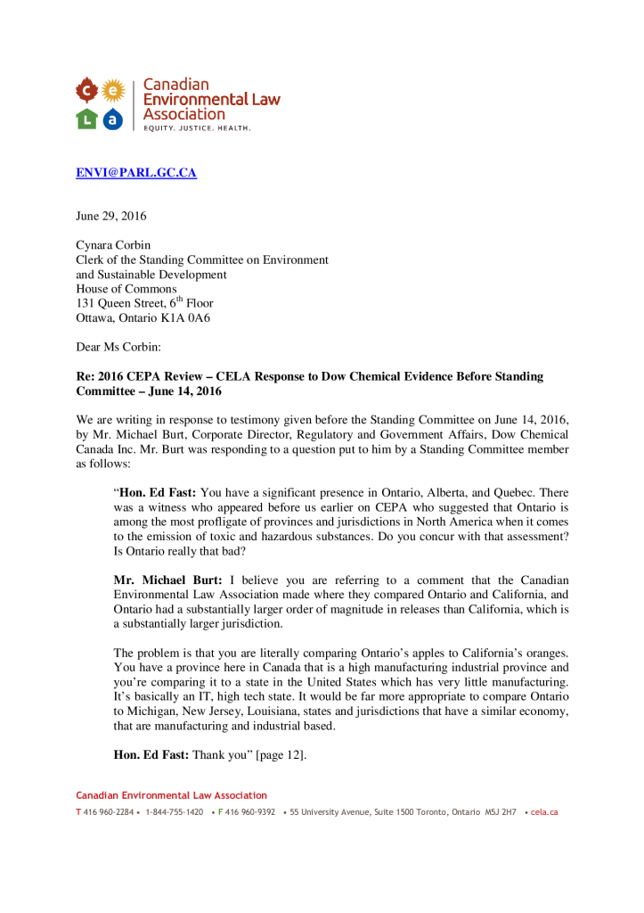 2016 CEPA Review – CELA Response to Dow Chemical Evidence Before Standing Committee – June 14, 2016