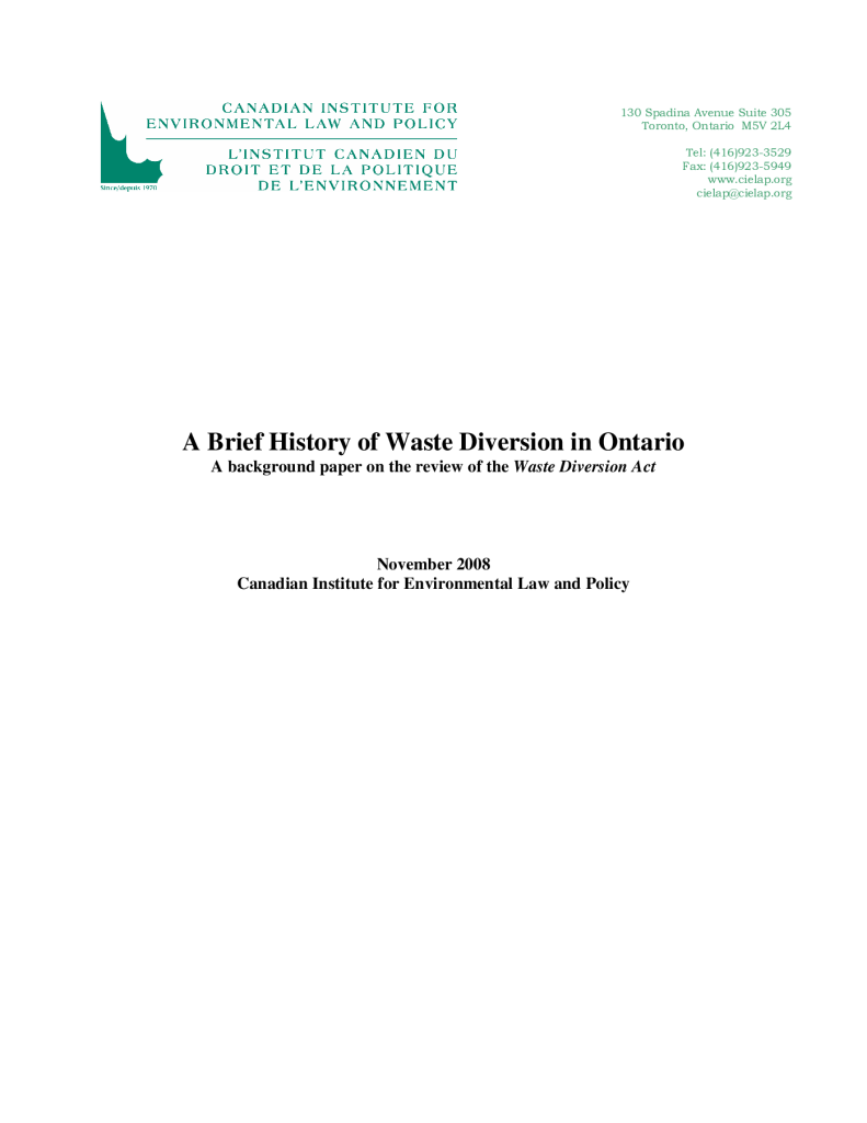 A brief history of waste diversion in Ontario : A background paper on the review of the Waste Diversion Act