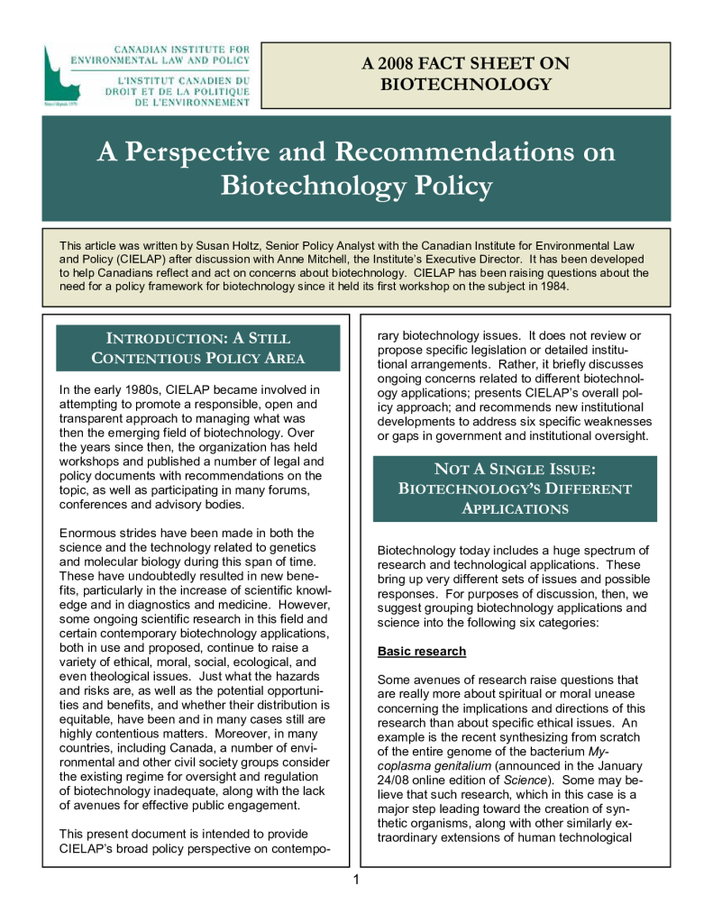 A perspective and recommendation on biotechnology policy