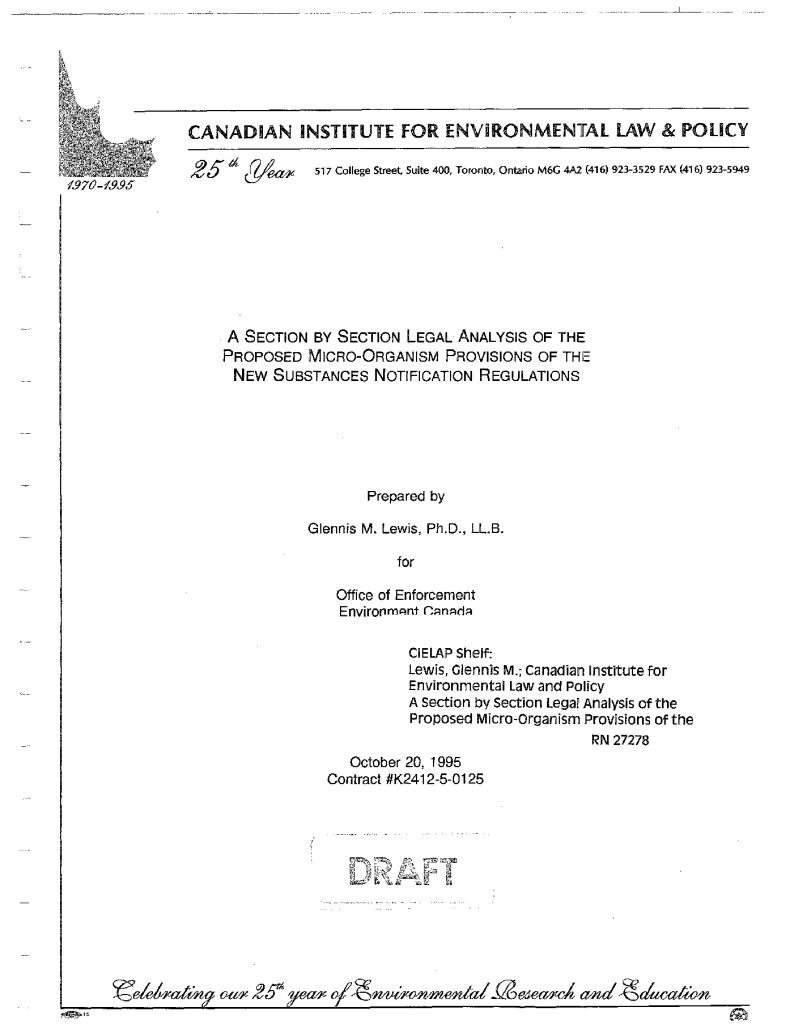 A section by section legal analysis of the proposed micro-organism provisions of the new substances notification regulations