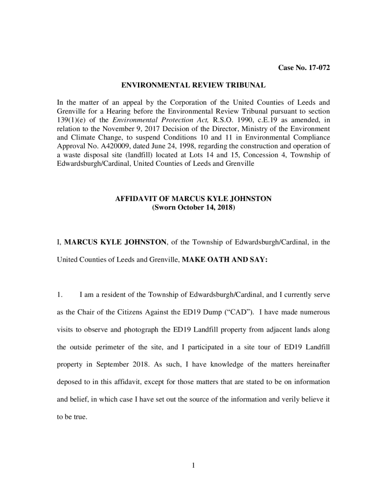 Affidavit of Marcus Kyle Johnston, Environmental Review Tribunal