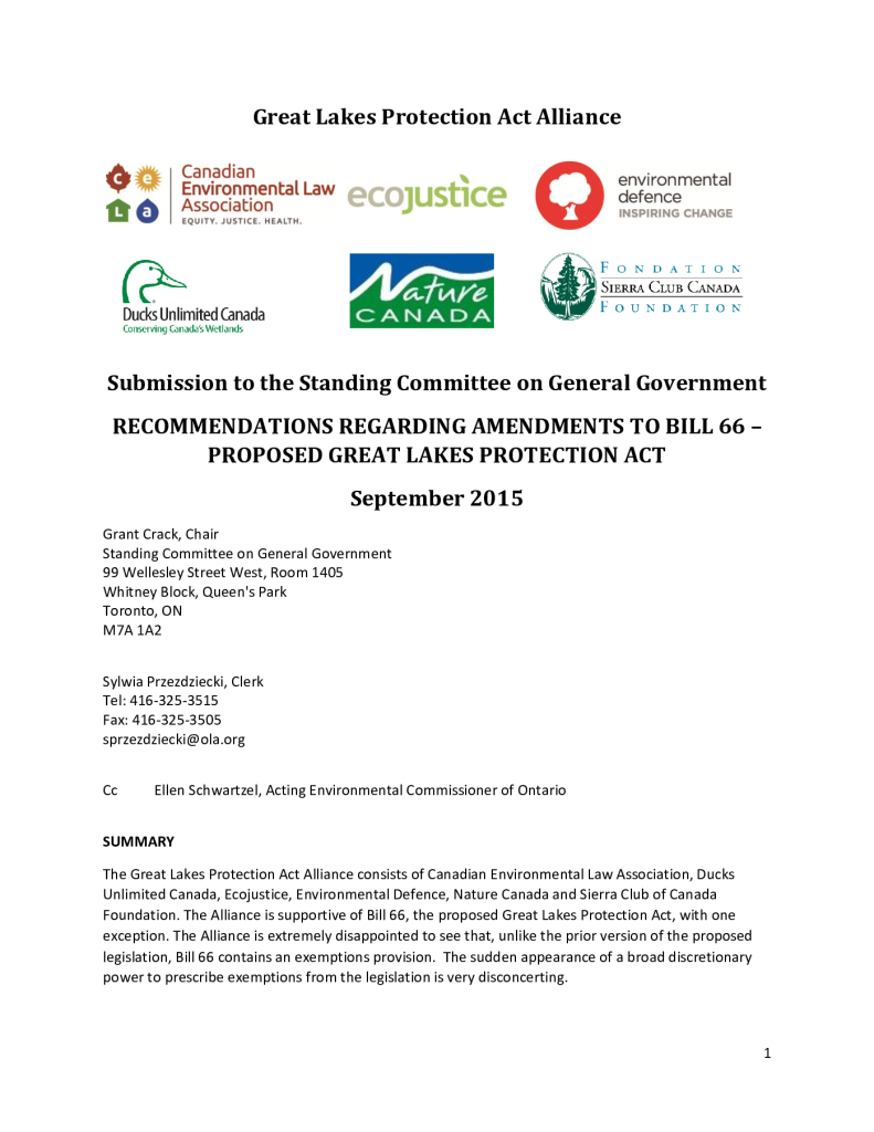 Amendments to Bill 66 – Proposed Great Lakes Protection Act
