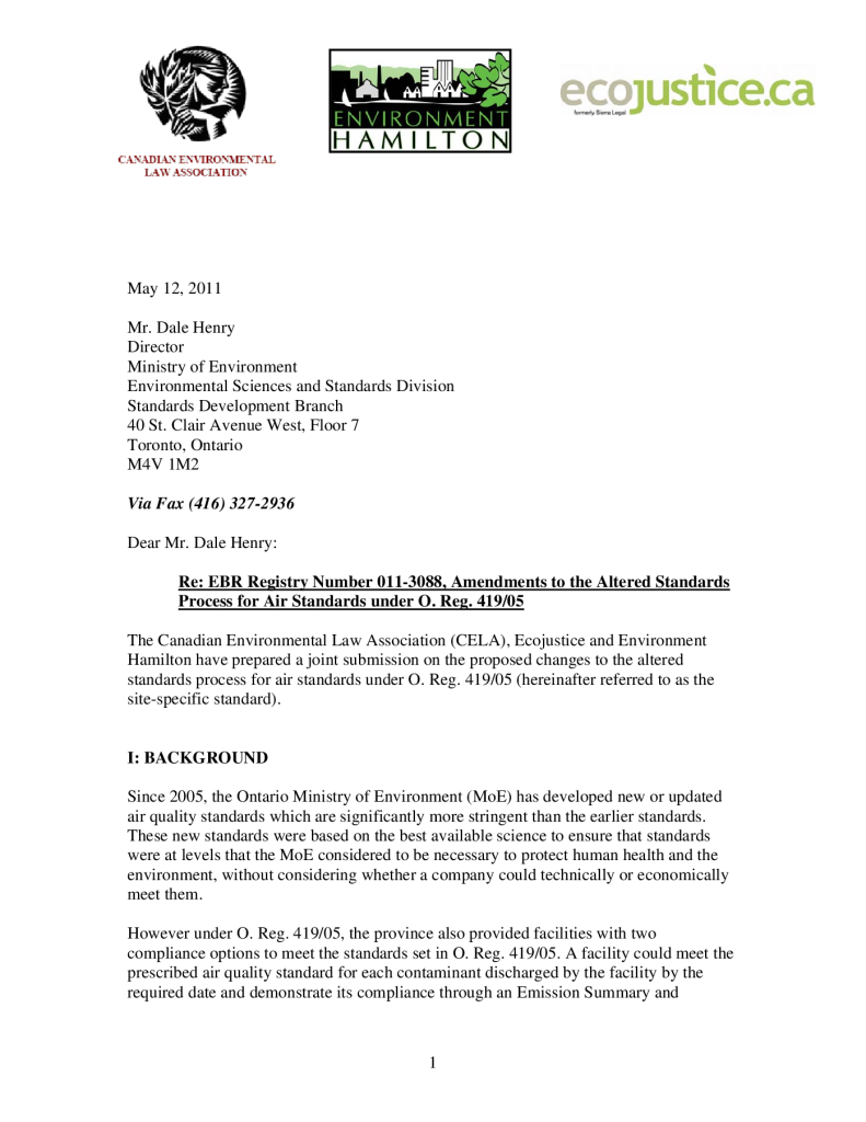 Amendments to the Altered Standards Process for Air Standards under O. Reg. 419/05