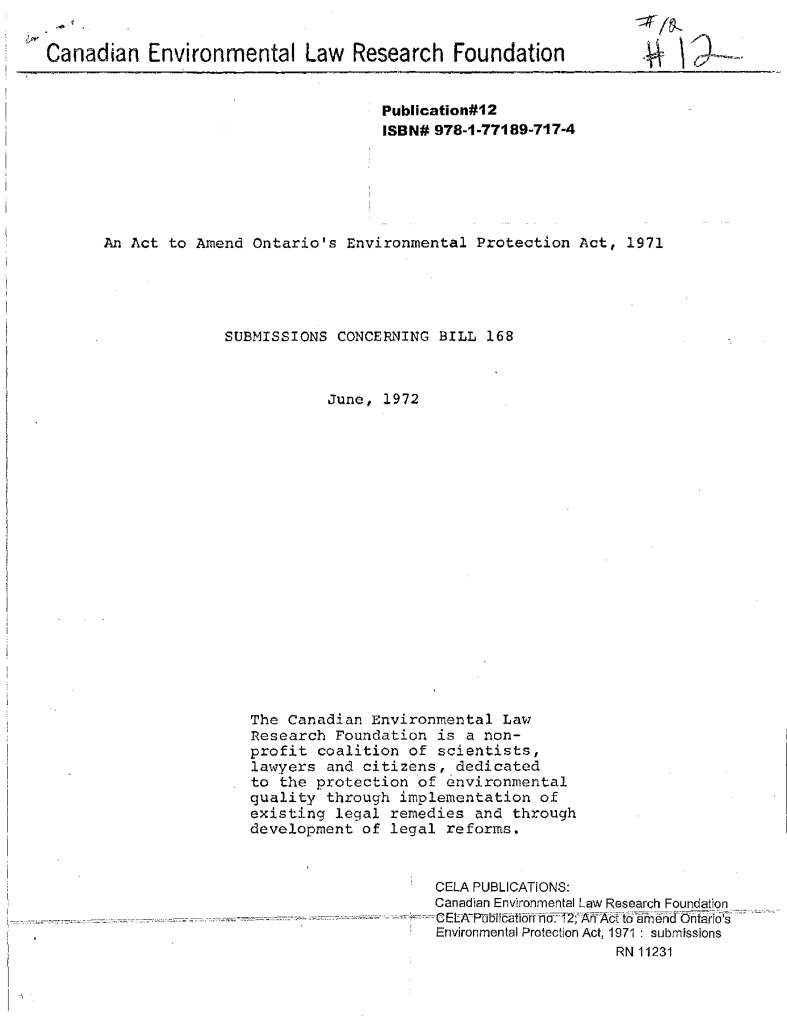 An act to amend Ontario’s environmental protection act, 1971: submissions concerning Bill 168