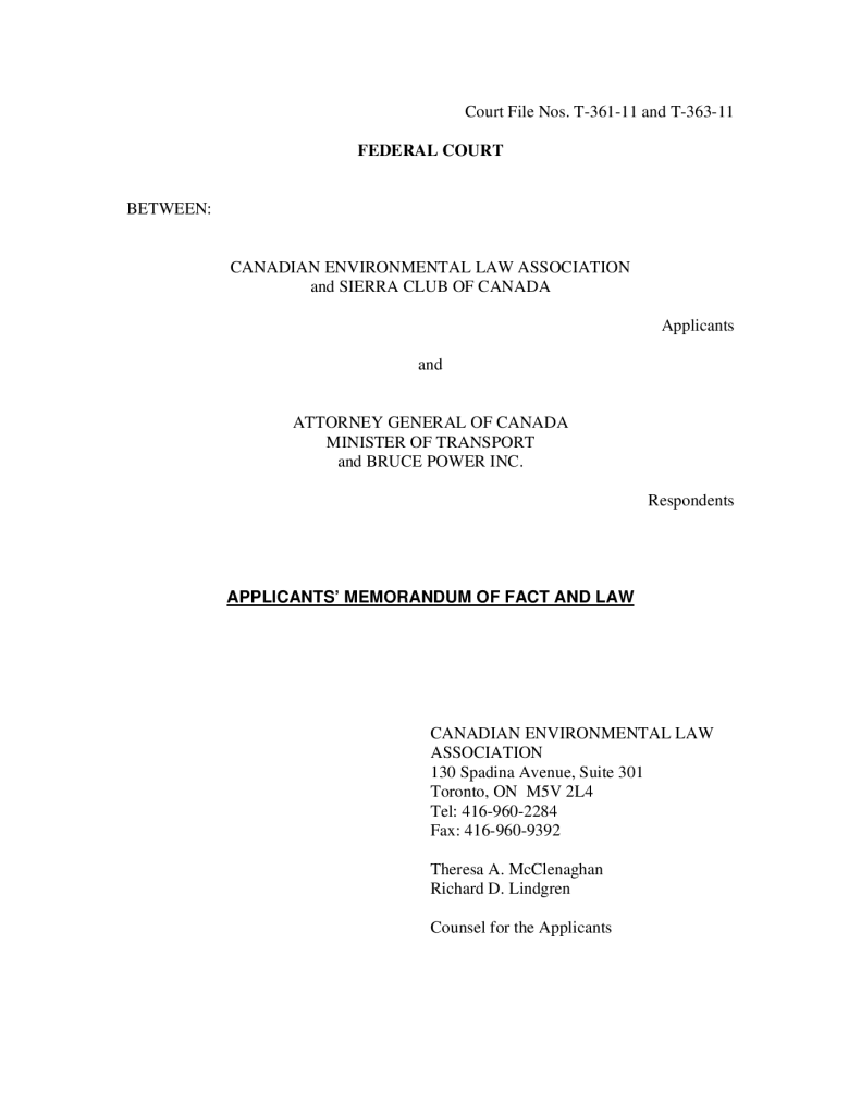 Applicants’ Memorandum of Fact and Law – Bruce Power proposal, radioactive waste transport