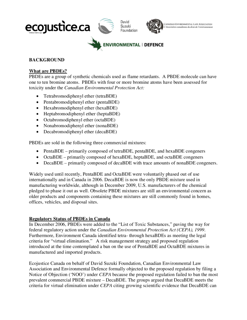 Backgrounder to September 2, 2010 Media Release An Overview of PBDEs and their Regulatory Status in Canada