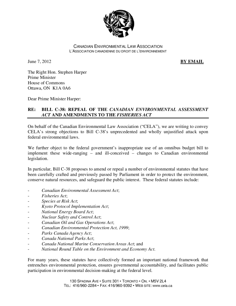 Bill C-38: Repeal of the Canadian Environmental Assessment Act and Amendments to the Fisheries Act