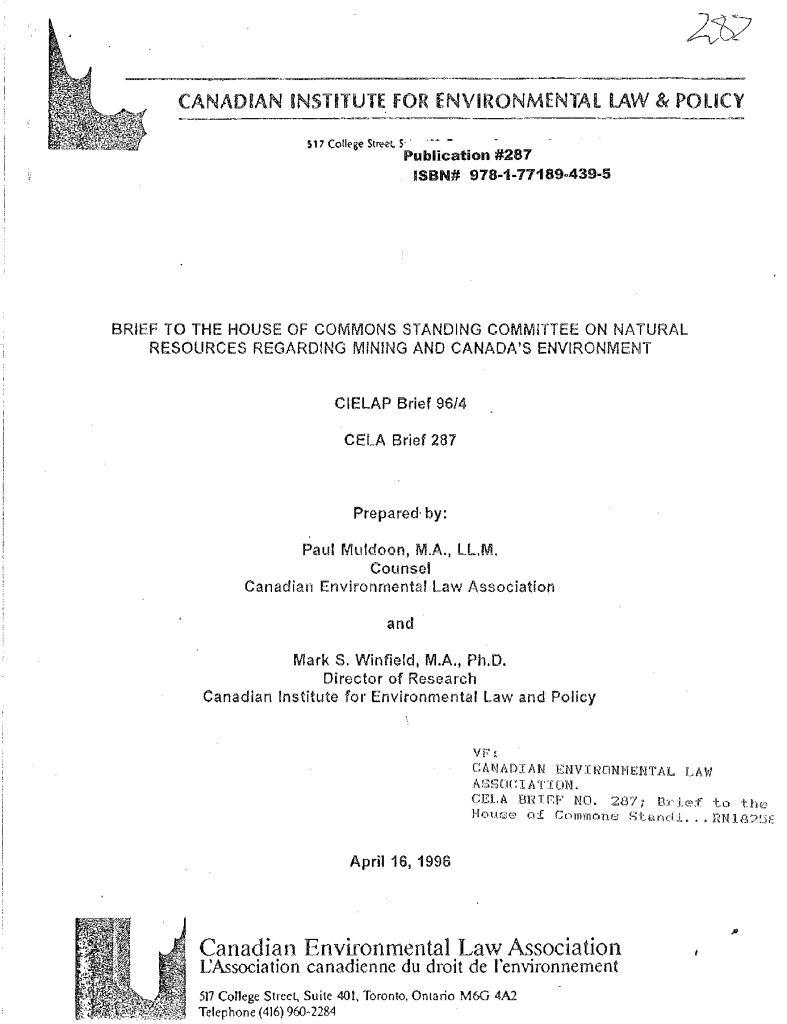 Brief to the House of Commons Standing Committee on Natural Resources regarding mining and Canada’s environment