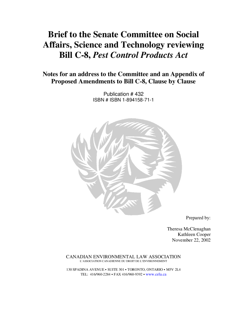 Brief to the Senate Committee on Social Affairs, Science and Technology reviewing Bill C-8, Pest Control Products Act