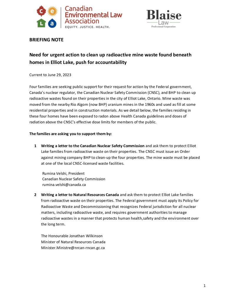 Briefing Note: Need for Urgent Action to Clean Up Radioactive Mine Waste in Elliot Lake