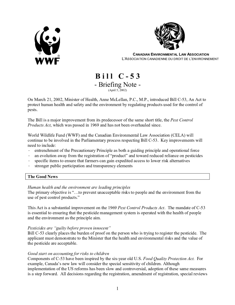 Briefing note on Bill C-53, An Act to protect human health and safety and the environment by regulating products used for the control of pests