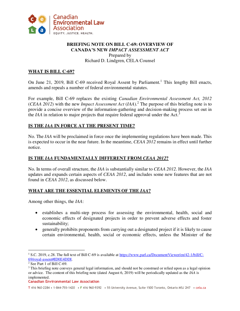 Briefing Note on Bill c-69: Overview of Canada’s New Impact Assessment Act