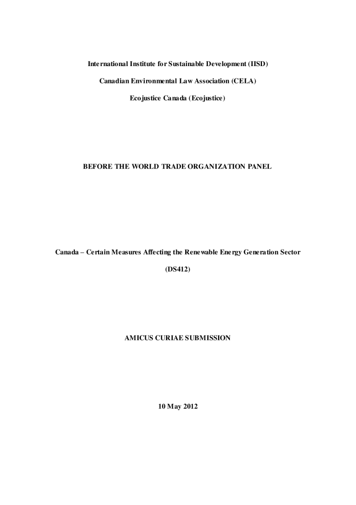 Canada – Certain Measures Affecting the Renewable Energy Generation Sector (DS412) Amicus Curiae Submission before the World Trade Organization panel
