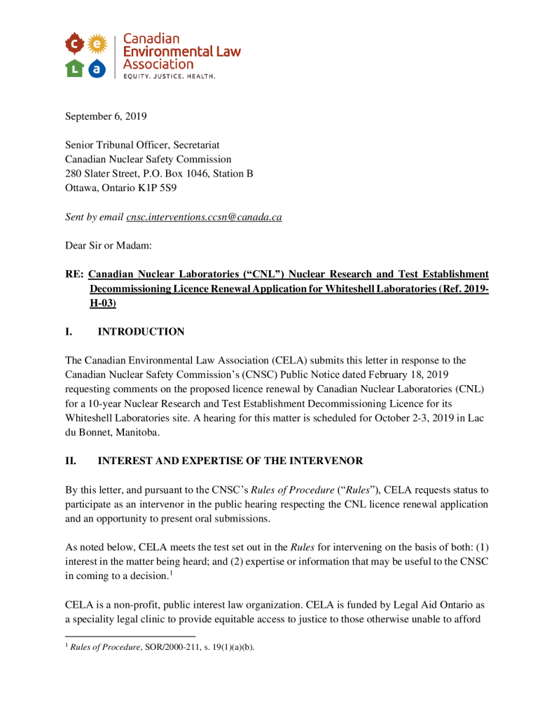 Canadian Nuclear Laboratories (“CNL”) Nuclear Research and Test Establishment Decommissioning Licence Renewal Application for Whiteshell Laboratories (Ref. 2019-H-03)