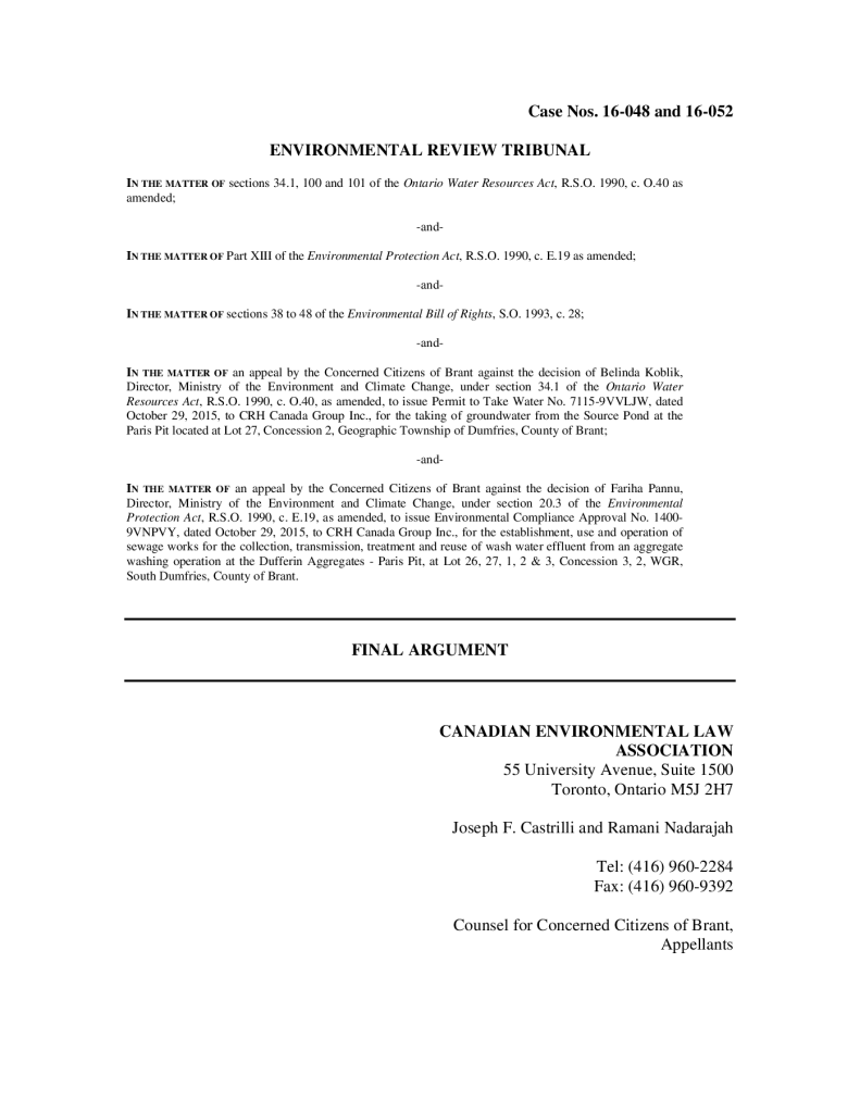 CCOB Final Argument before the Environmental Review Tribunal Case Nos. 16-048 and 16-052