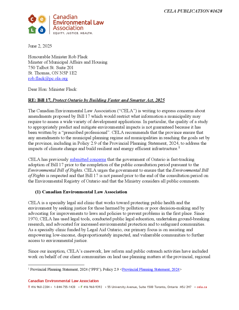 CELA Comments on Bill 17, Protect Ontario by Building Faster and Smarter Act, 2025