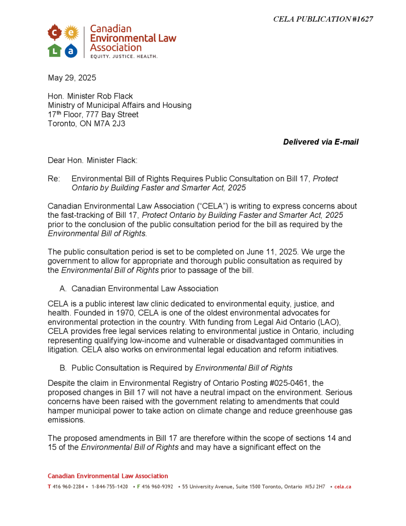 CELA Comments on Environmental Bill of Rights Requires Public Consultation on Bill 17, Protect Ontario by Building Faster and Smarter Act, 2025
