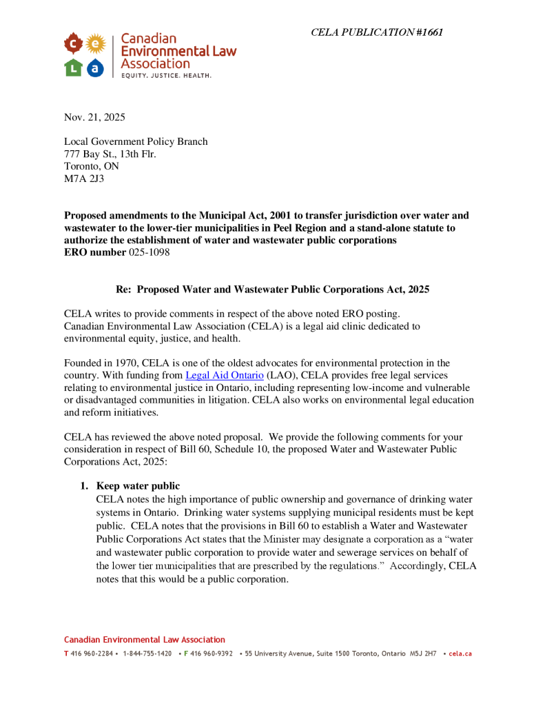 CELA Comments on Proposed Water and Wastewater Public Corporations Act, 2025