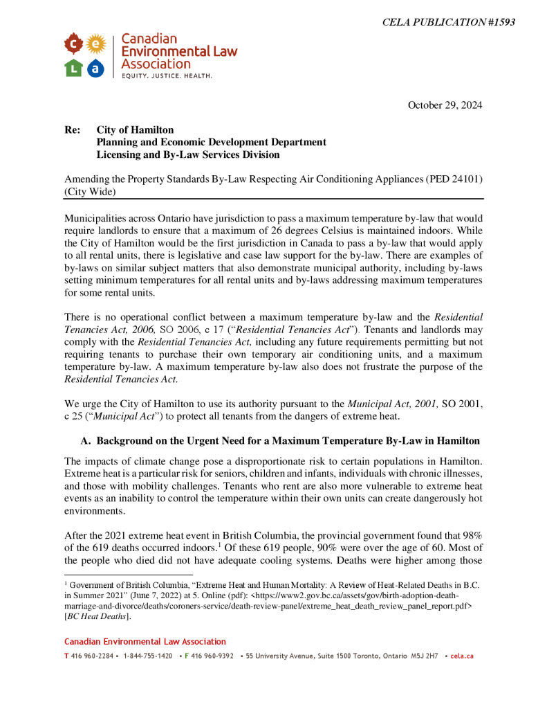 CELA letter on Legal Jurisdiction for Maximum Temperature By-laws