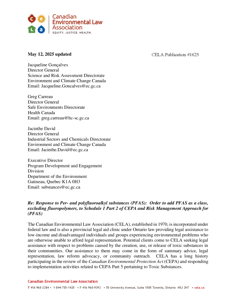 CELA Response to Order to add PFAS to CEPA and Risk Management Approach for PFAS