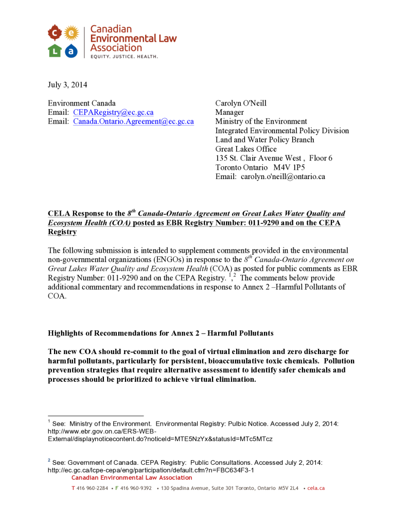 CELA Response to the 8th Canada-Ontario Agreement on Great Lakes Water Quality and Ecosystem Health (COA)