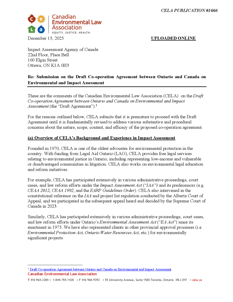 CELA Submission on Draft Co-operation Agreement between Ontario and Canada on Environmental and Impact Assessment