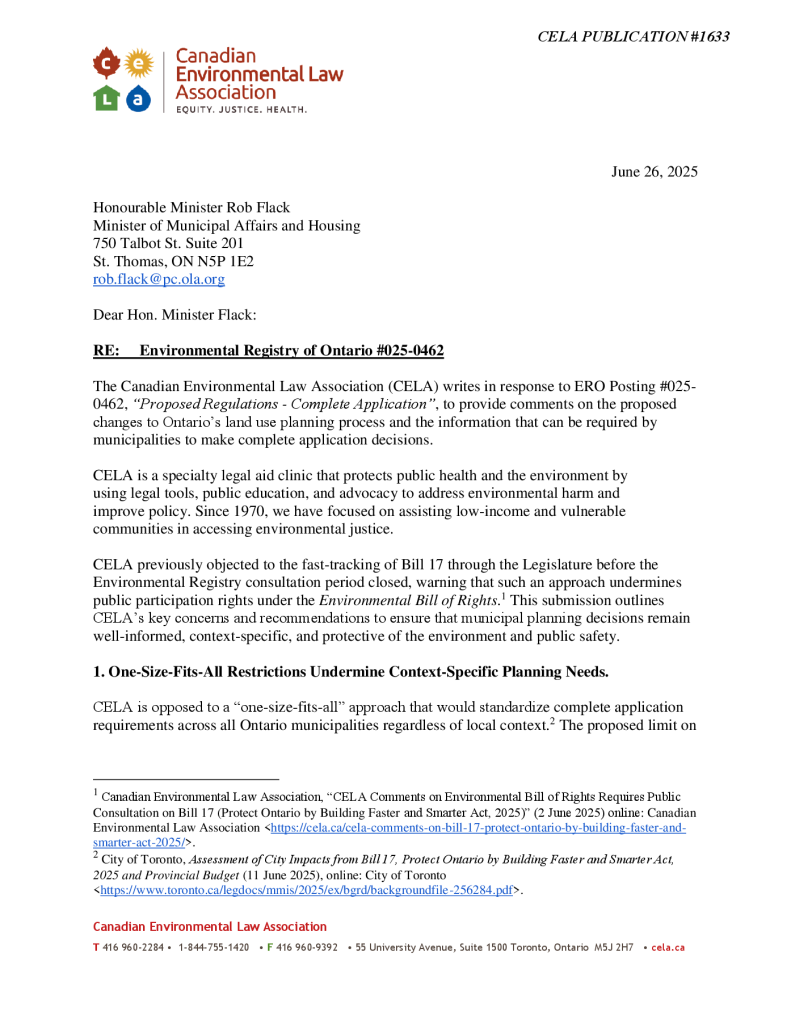 CELA Submission on ERO Posting #025-0462 “Proposed Regulations – Complete Application”