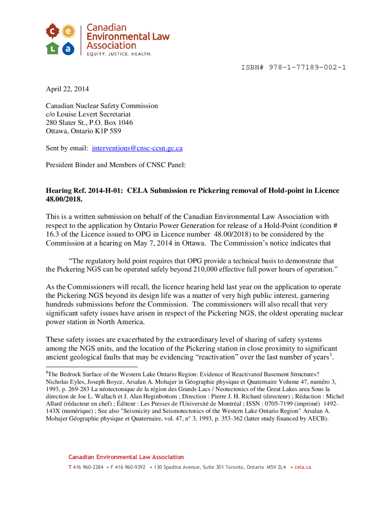 CELA Submission re Pickering removal of Hold-point in Licence 48.00/2018 (Hearing Ref. 2014-H-01)