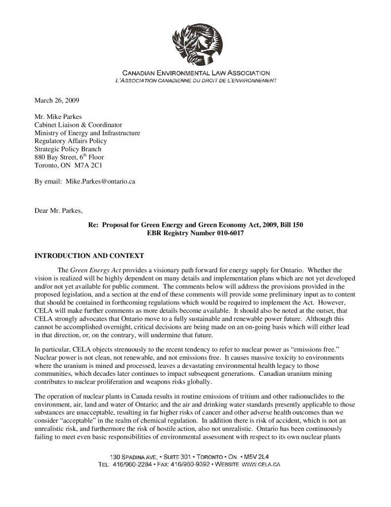 CELA Submissions on Green Energy and Green Economy Act, 2009