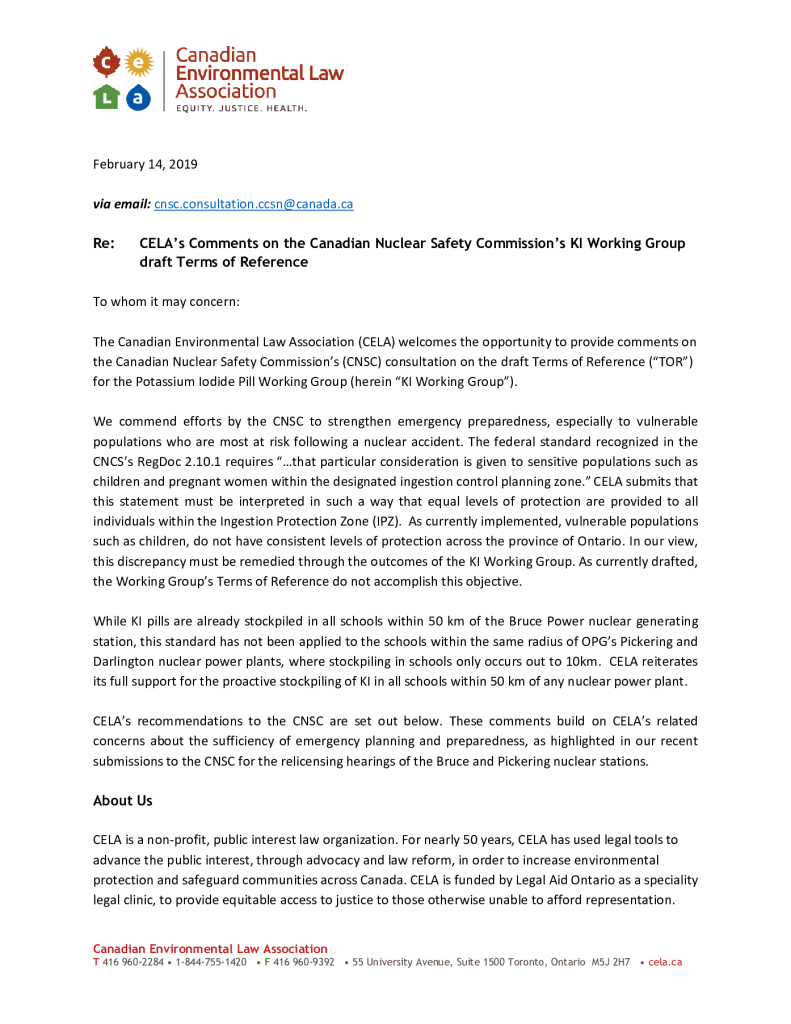 CELA’s Comments on the Canadian Nuclear Safety Commission’s KI Working Group draft Terms of Reference