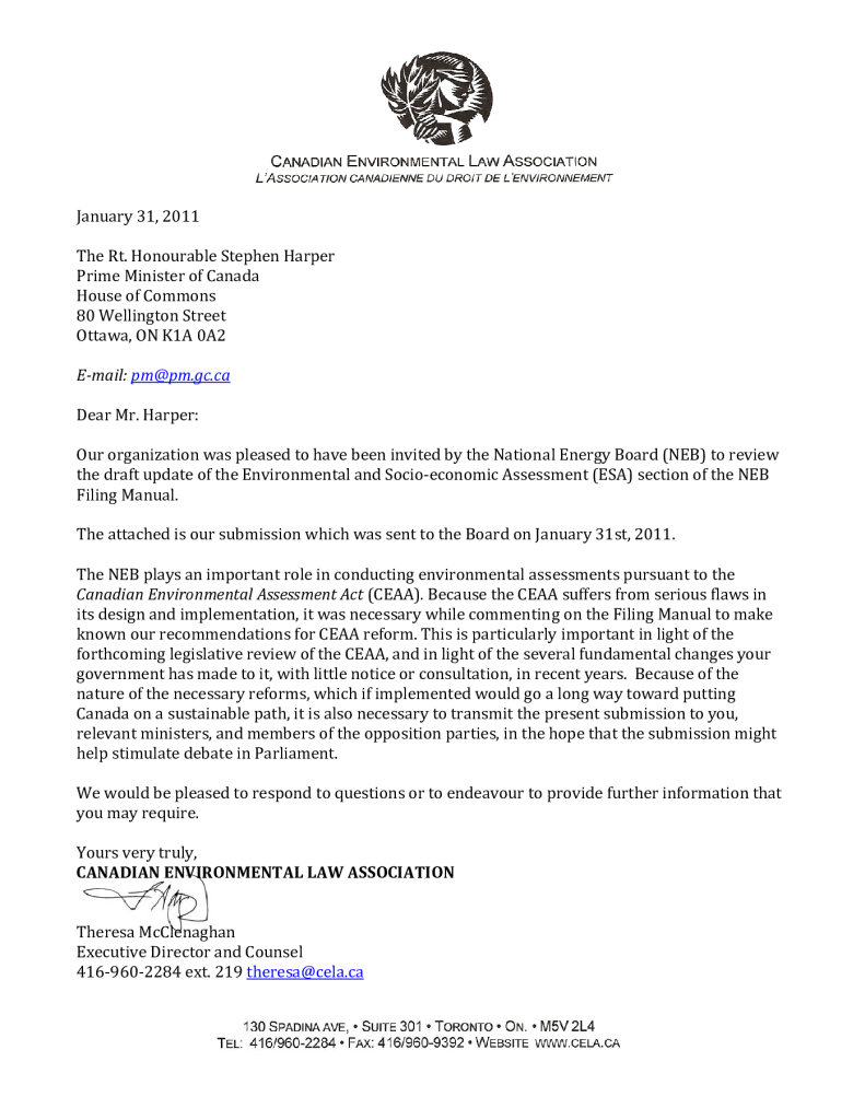 CELA’s comments to Prime Minister Stephen Harper regarding our review of the draft update of the Environmental and Socio-economic Assessment (ESA) section of the NEB Filing Manual