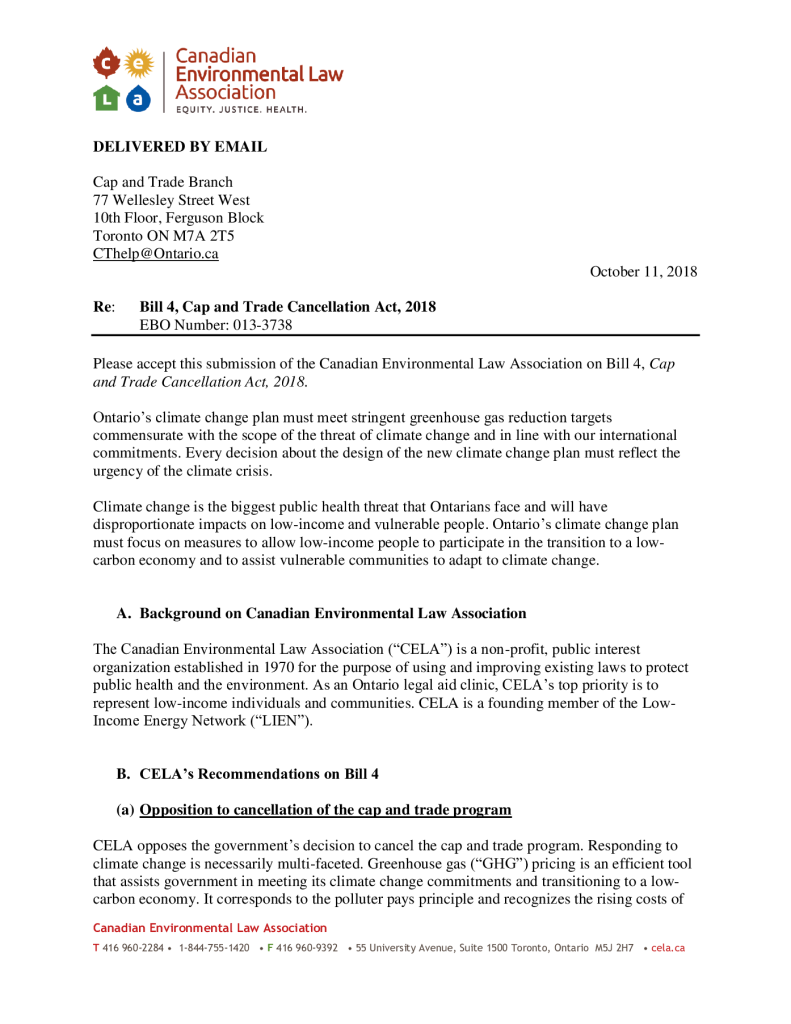 CELA’s Submission on Bill 4 – Cap and Trade Revocation Act
