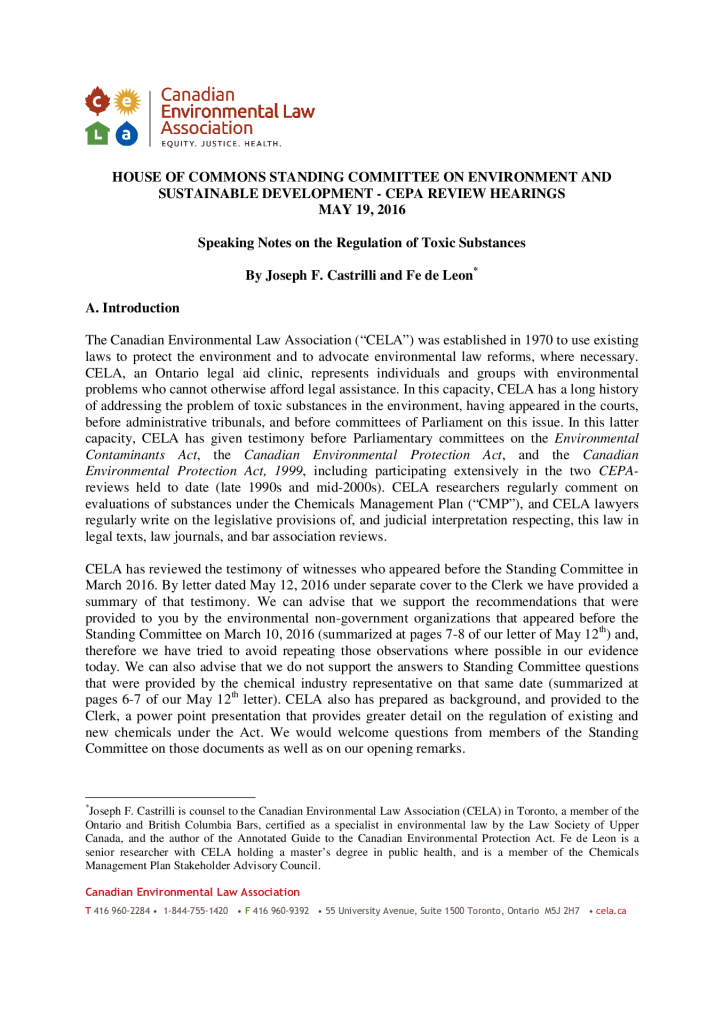 CEPA Review – Speaking Notes on the Regulation of Toxic Substances