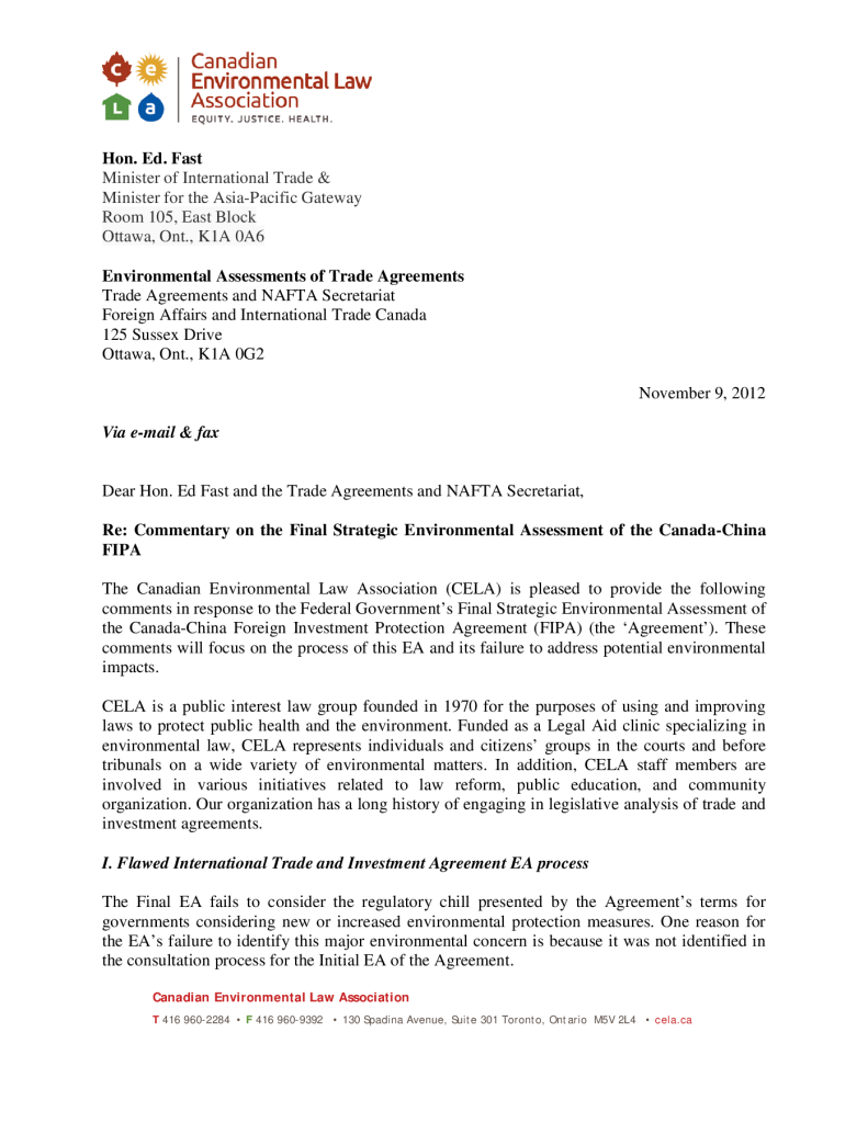 Comment on the Canada-China FIPA Final EA