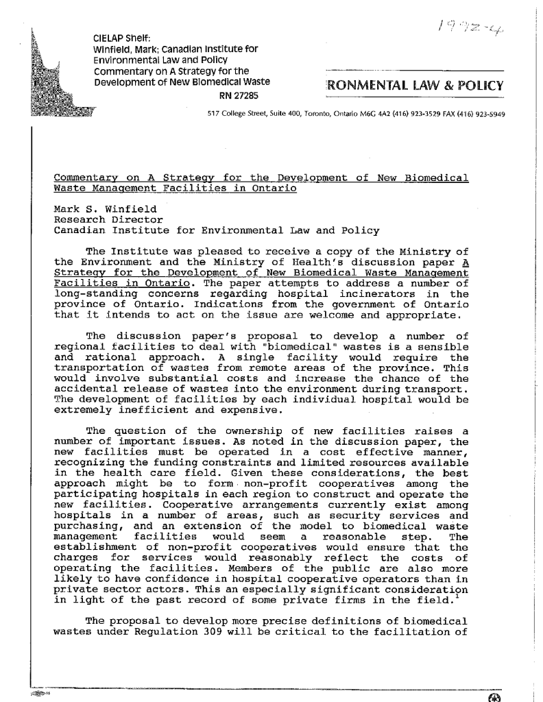 Commentary on a strategy for the development of new biomedical waste management facilities in Ontario