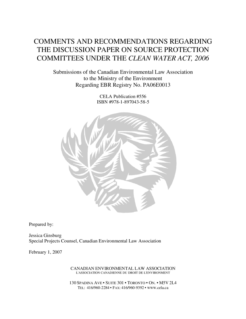 Comments and recommendations regarding the discussion paper on source protection committees under the Clean Water Act, 2006