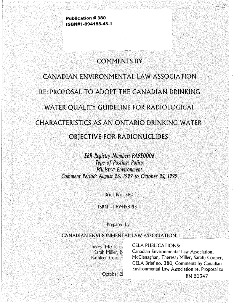Comments by Canadian Environmental Law Association re: proposal to adopt the Canadian drinking water quality guideline for radiological characteristics as an Ontario drinking water objective for radionuclides