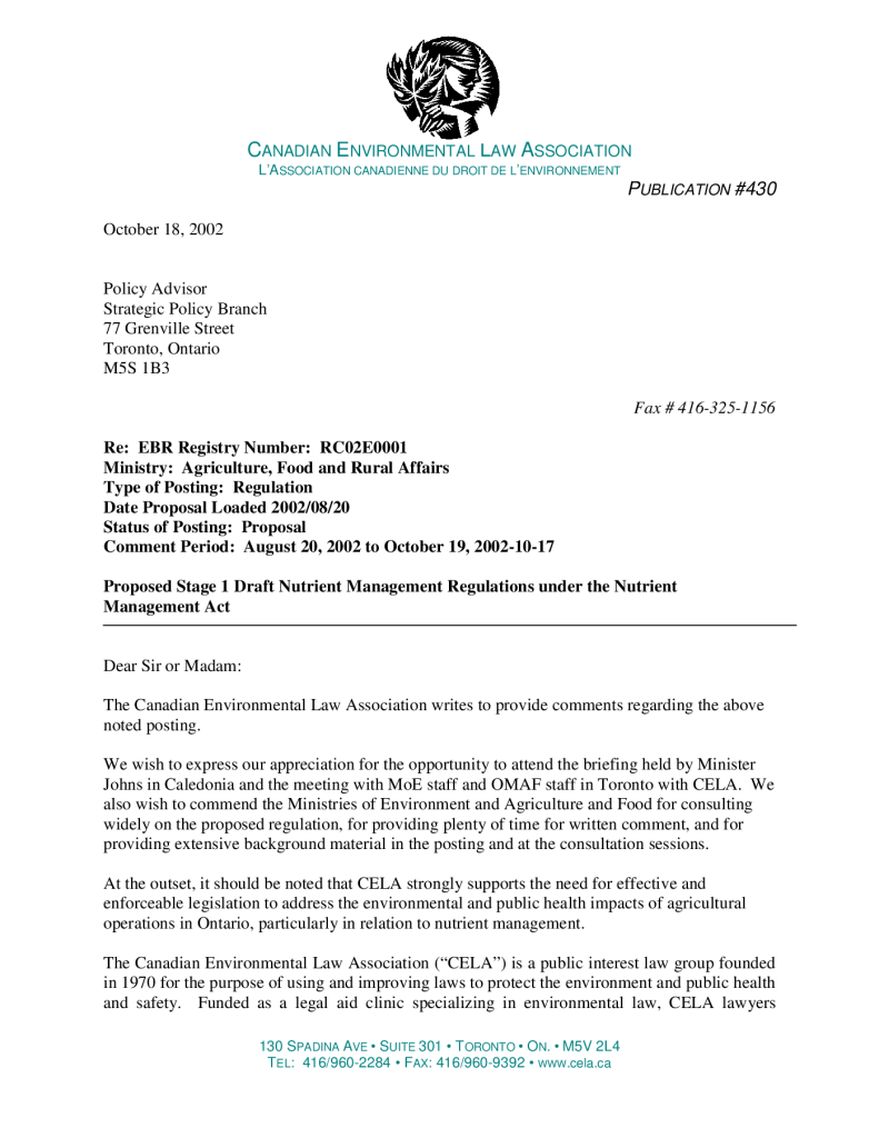 Comments by CELA re: Proposed Stage 1 Draft Nutrient Management Regulations under the Nutrient Management Act