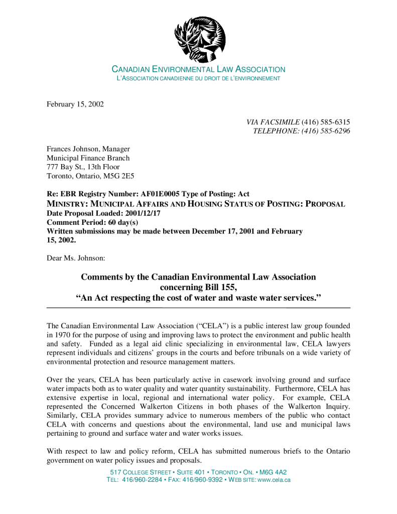 Comments by the Canadian Environmental Law Association concerning Bill 155, “An act respecting the cost of water and waste water services”