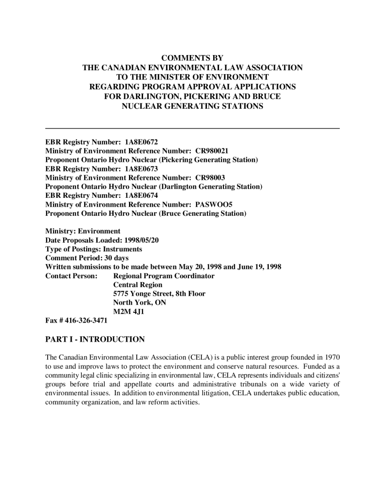 Comments by the Canadian Environmental Law Association to the Minister of Environment regarding program approval applications for Darlington, Pickering, and Bruce nuclear generating stations