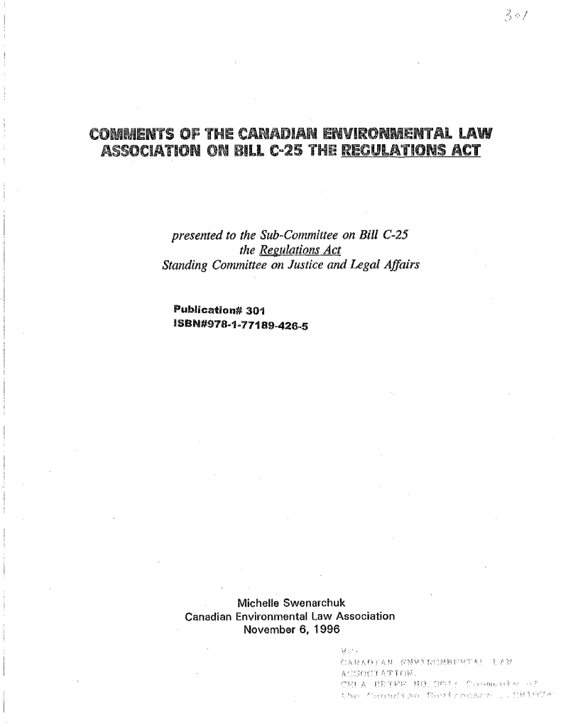 Comments of the Canadian Environmental Law Association on Bill C-25 The Regulations Act