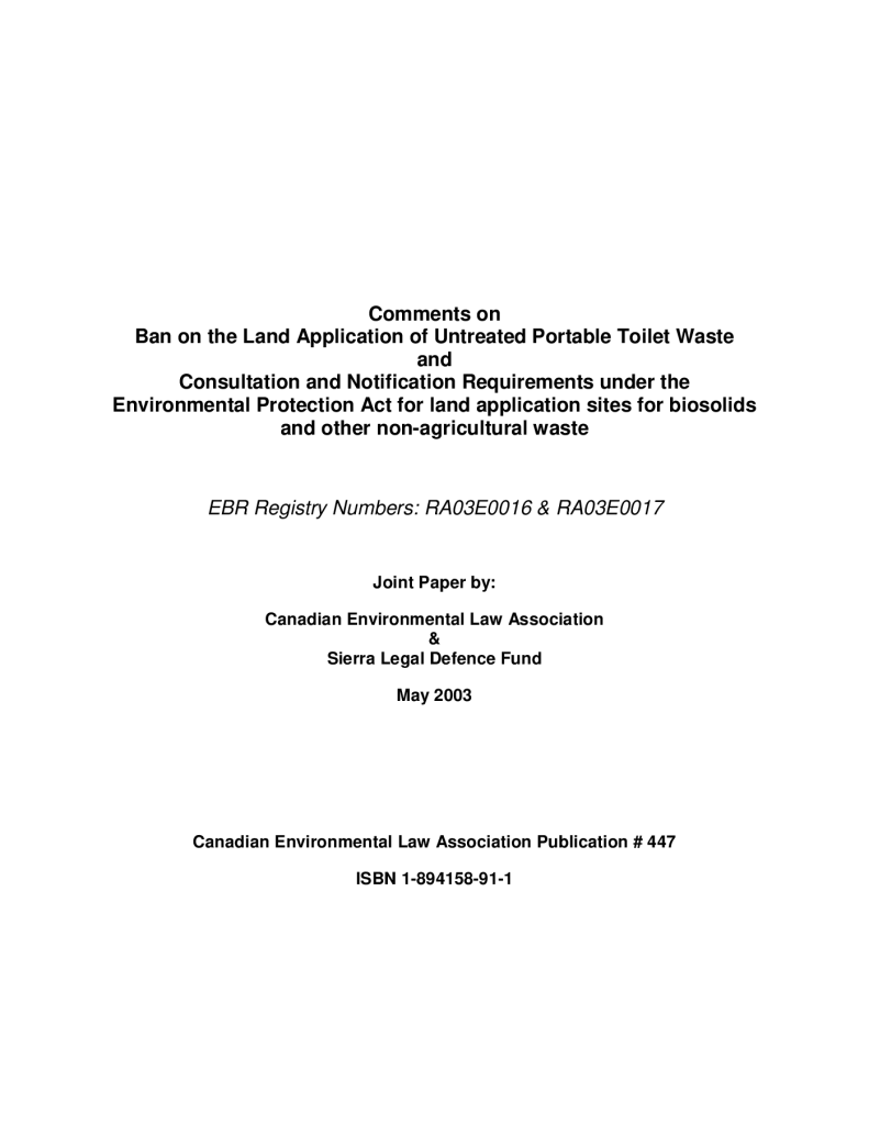 Comments on Ban on the Land Application of Untreated Portable Toilet Waste and Consultation and Notificiation Requirements under the Environmental Protection Act for land application sites for biosolids and other non-agricultural waste