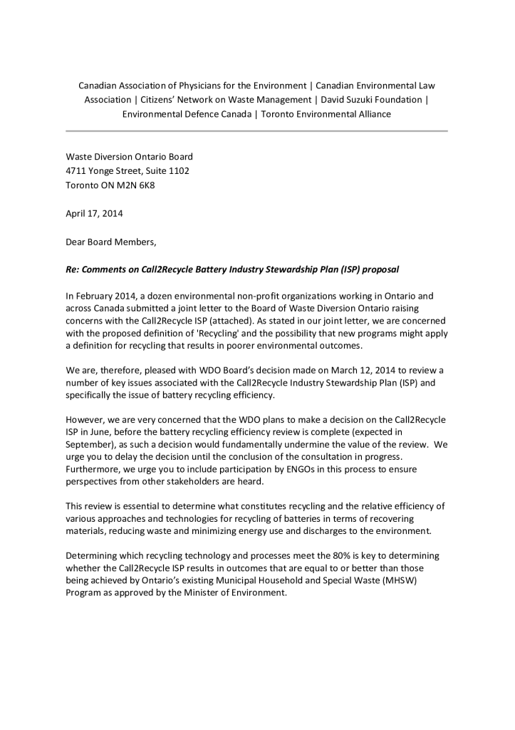 Comments on Call2Recycle Battery Industry Stewardship Plan (ISP) proposal