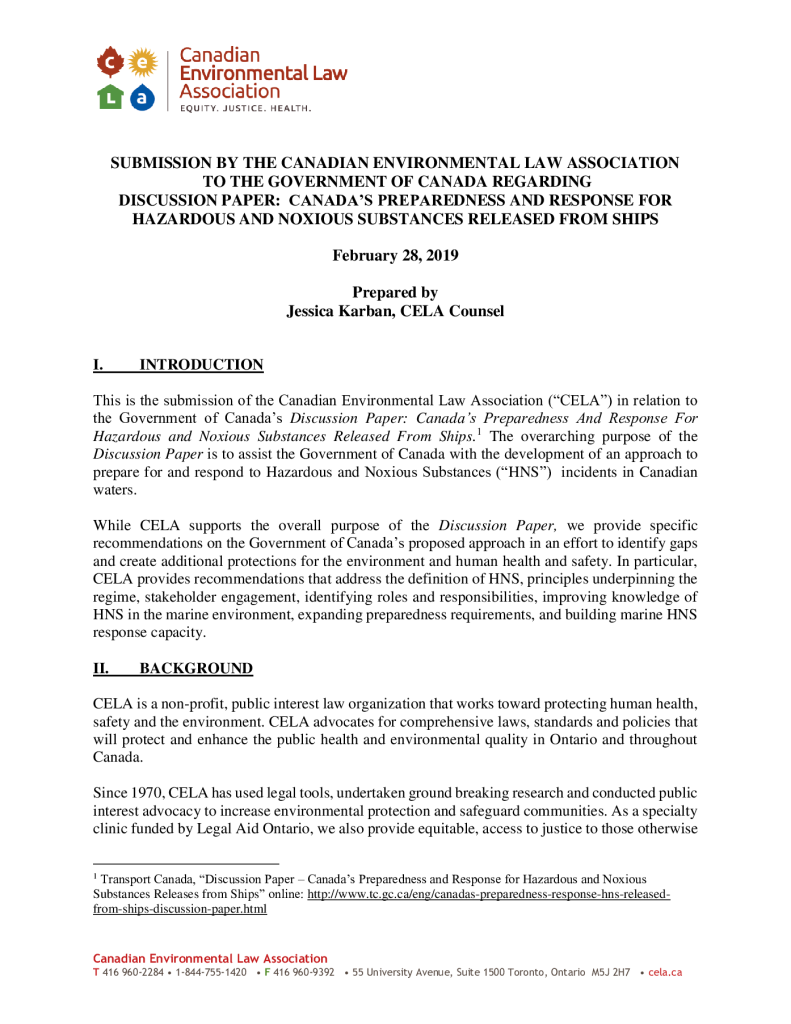 Comments on Canada’s Ship-Source Spill Preparedness and Response: Hazardous and Noxious Substances