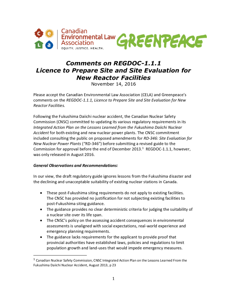 Comments on REGDOC-1.1.1 – Licence to Prepare Site and Site Evaluation for New Reactor Facilities