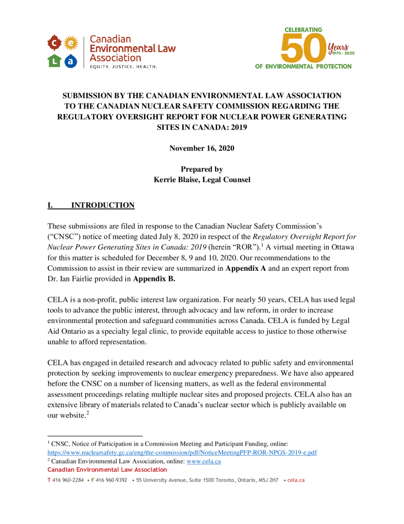 Comments on Regulatory Oversight Report for Nuclear Power Generating Sites in Canada: 2019