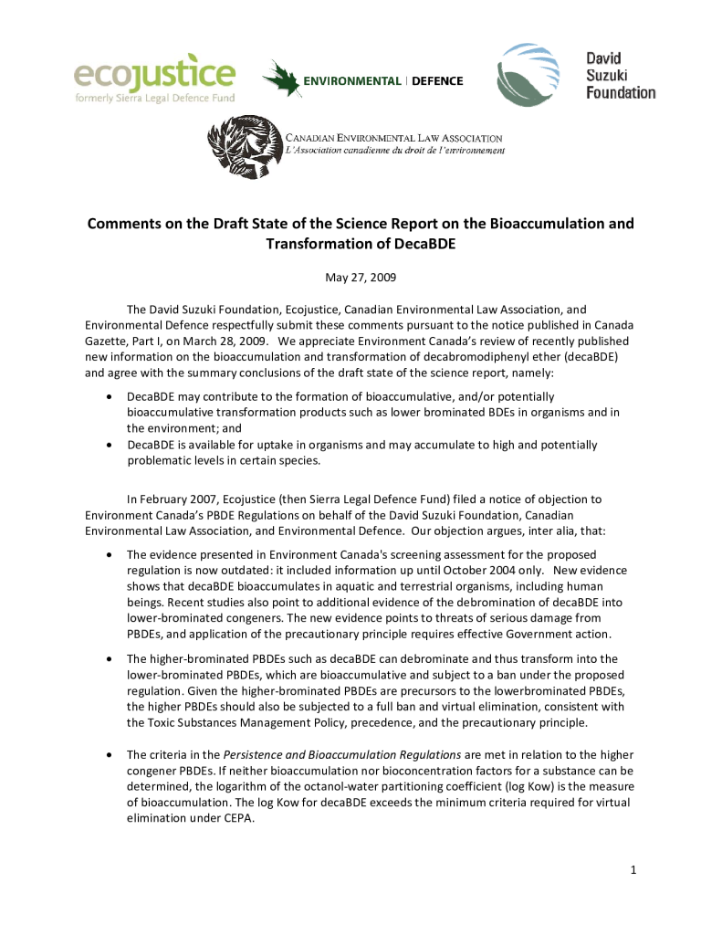Comments on the Draft State of the Science Report on the Bioaccumulation and Transformation of DecaBDE
