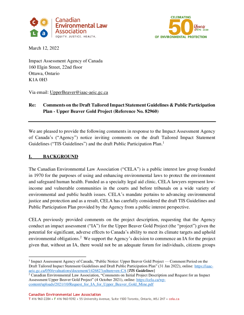 Comments on the Draft Tailored Impact Statement Guidelines & Public Participation Plan – Upper Beaver Gold Project