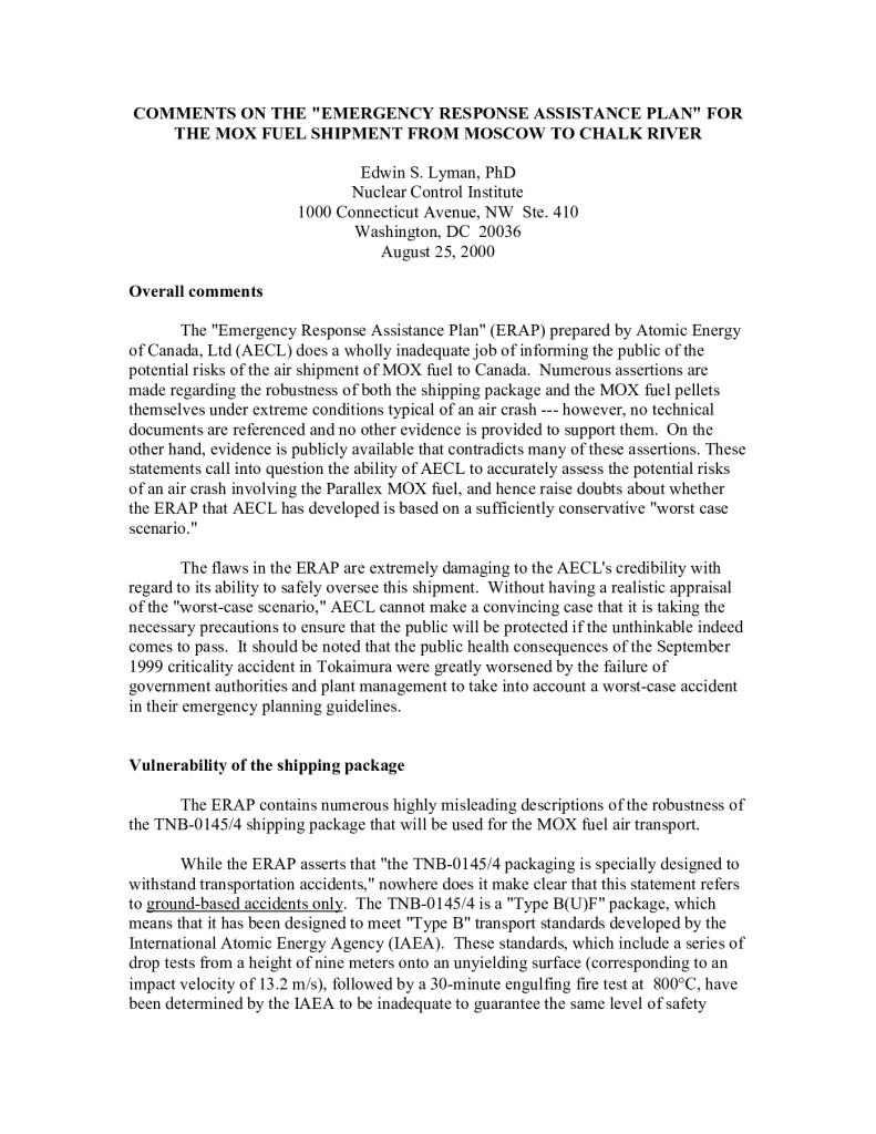 Comments on the Emergency Response Assistance Plan for MOX Fuel Shipment from Moscow to Chalk River